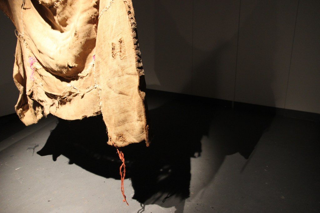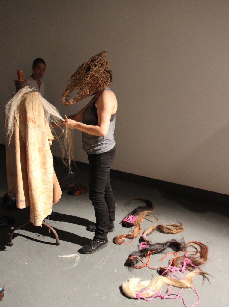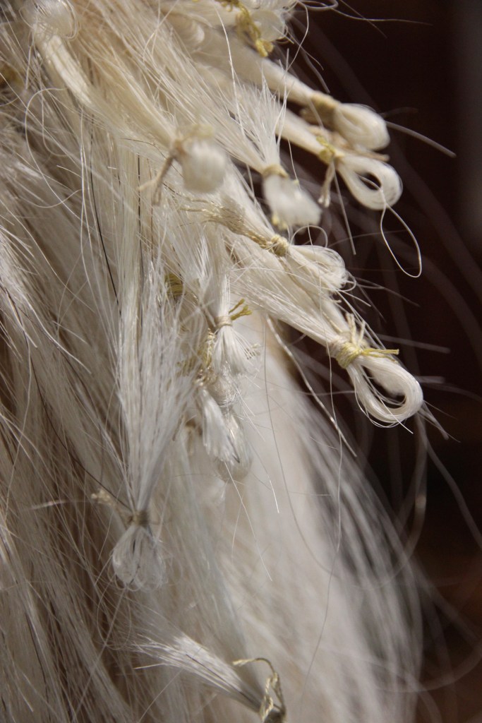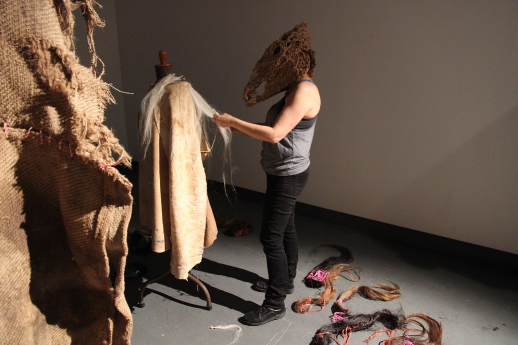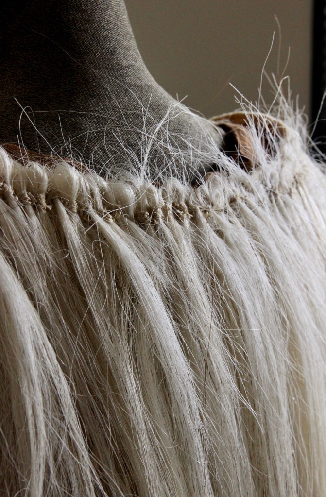 Vintage hand made horse rugs (circa 1970), bamboo, hay string, horse tails (collected from own horses and ponies), dressmaker dummy, eco-dyed wool blankets, silk thread, needle, yarn.