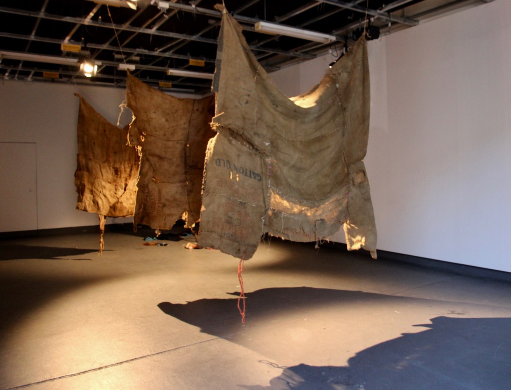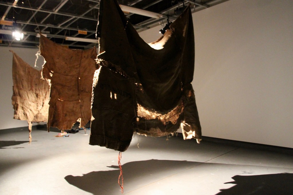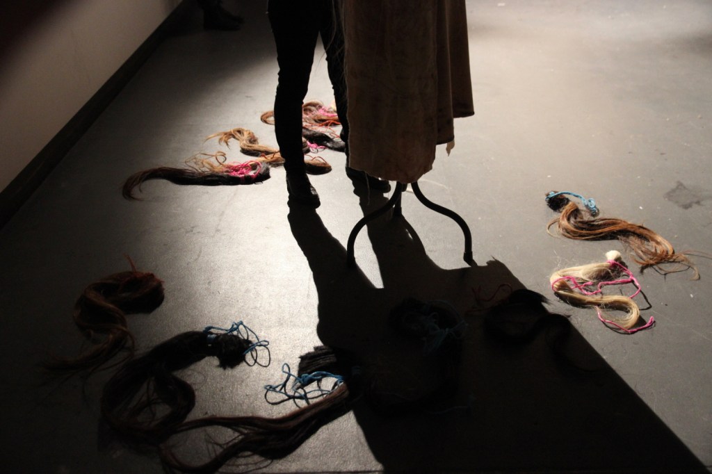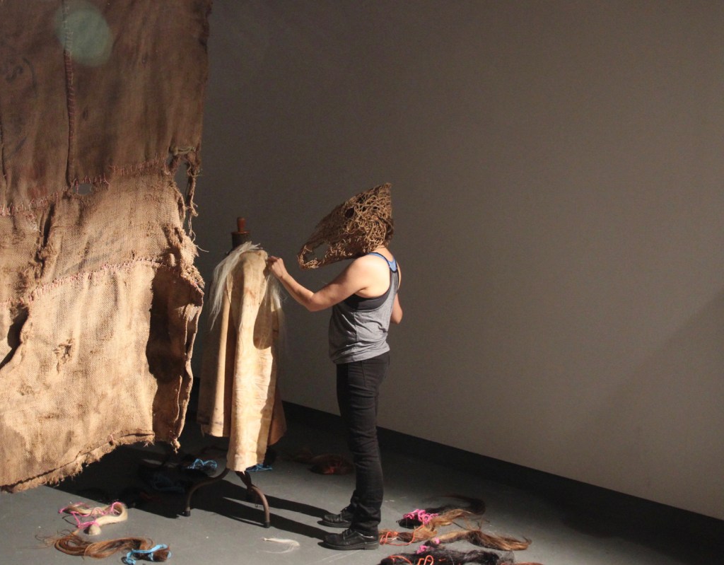Vintage hand made horse rugs (circa 1970), bamboo, hay string, horse tails (collected from own horses and ponies), dressmaker dummy, eco-dyed wool blankets, silk thread, needle, yarn.