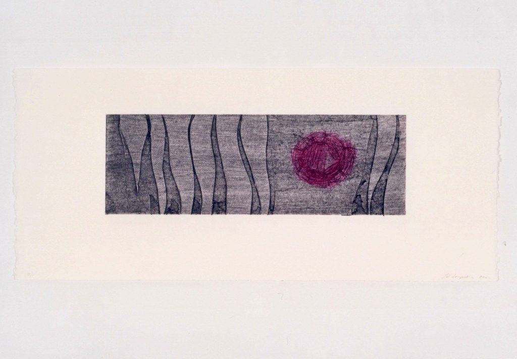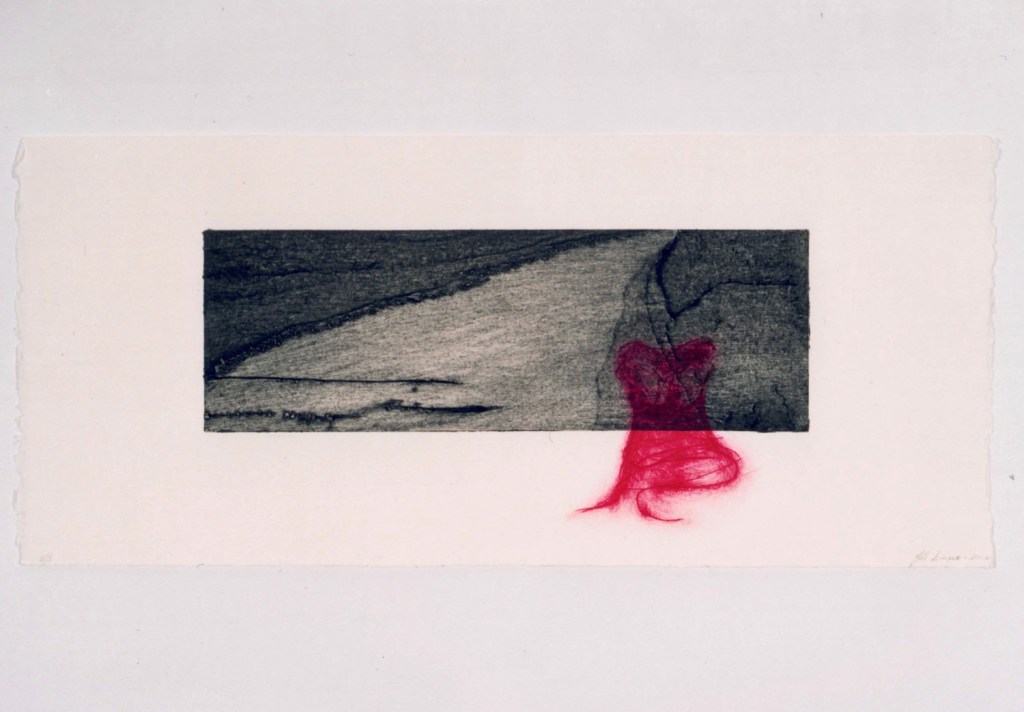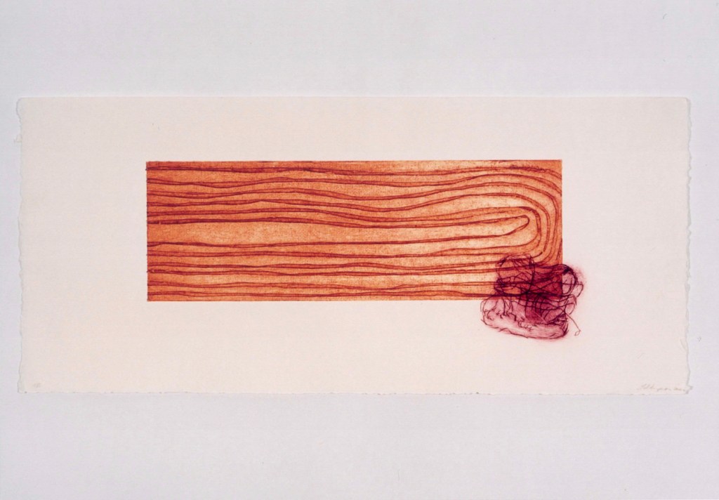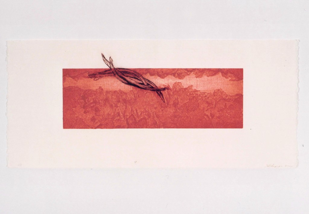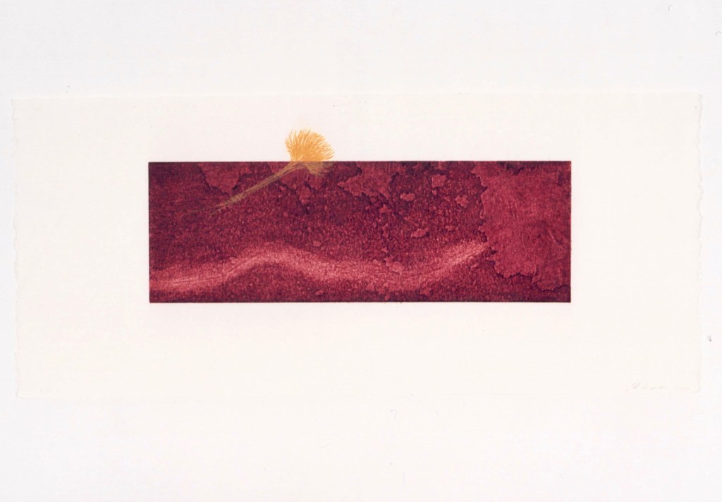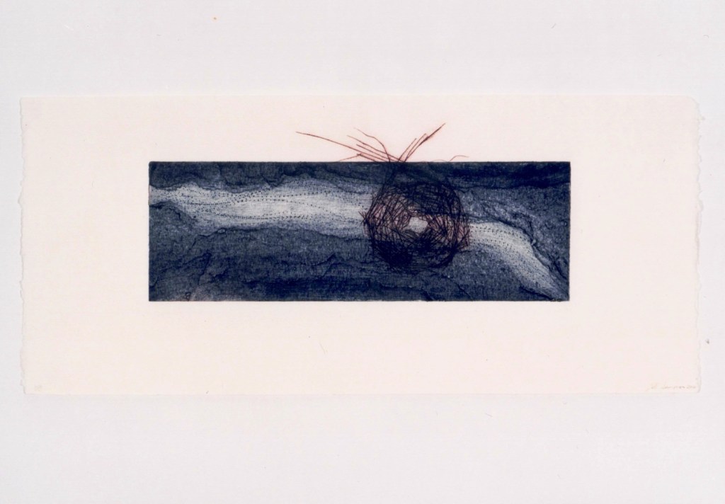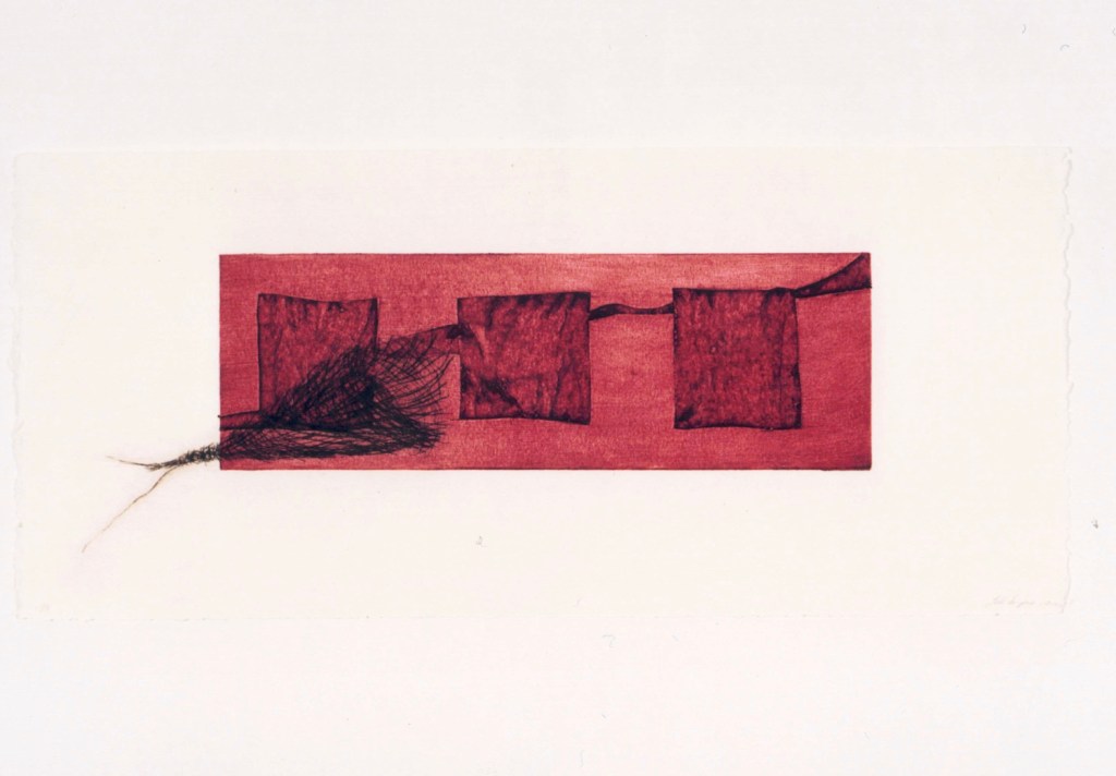 I approached this body of work by taking selected extracts from his letters, that tell the story of how this unfolded. For each letter I made small sculptural pieces with collected objects and materials found on the farm, where I had been living at the time when I received the letters. I also made a collograph for each of the selected written extracts. The collographs are the static plate, representative of the letters that carried our words across the globe, while the drypoints document something of my emotional responses – the hope, excitement, discovery, longing, loss and pain.