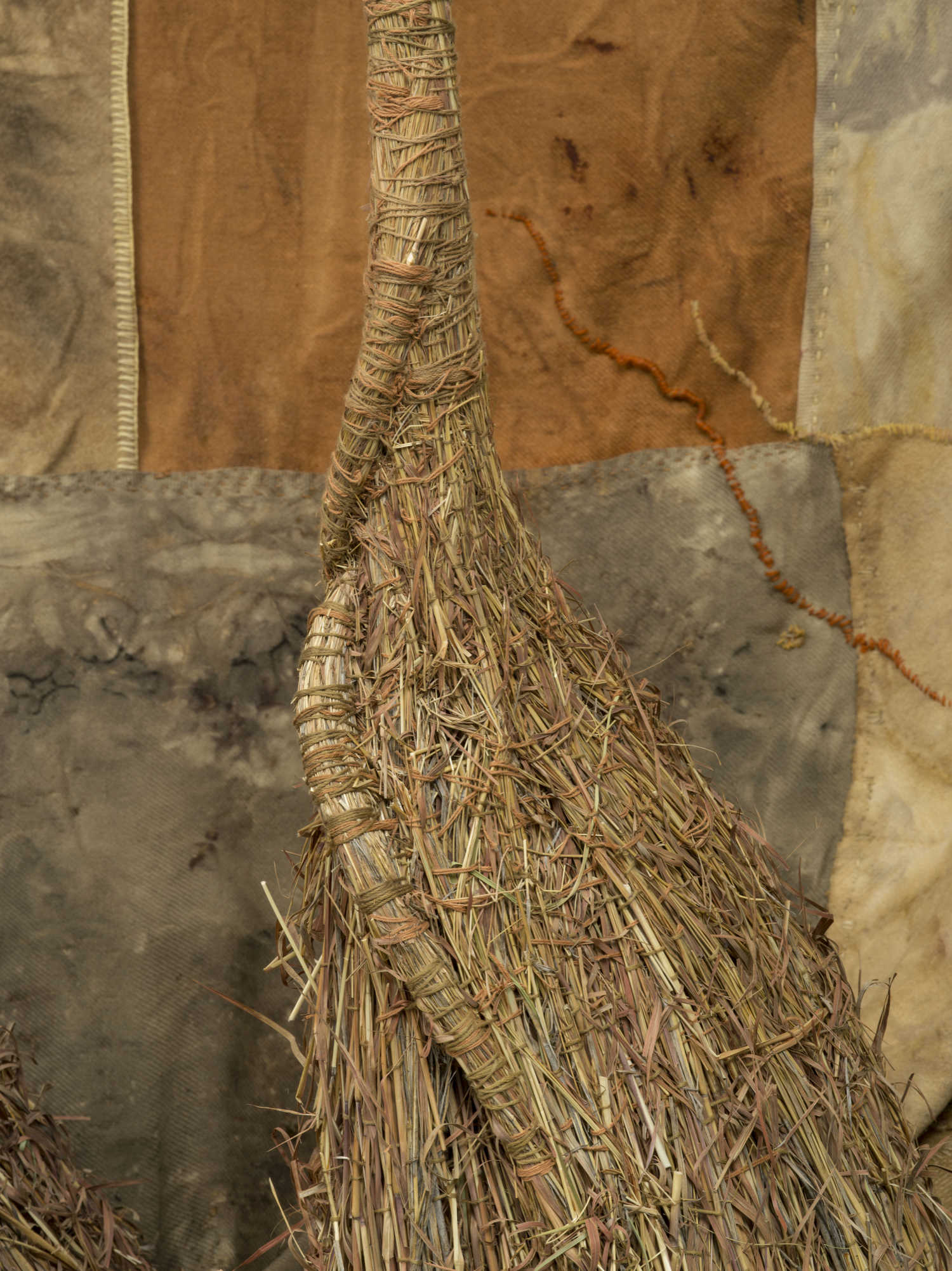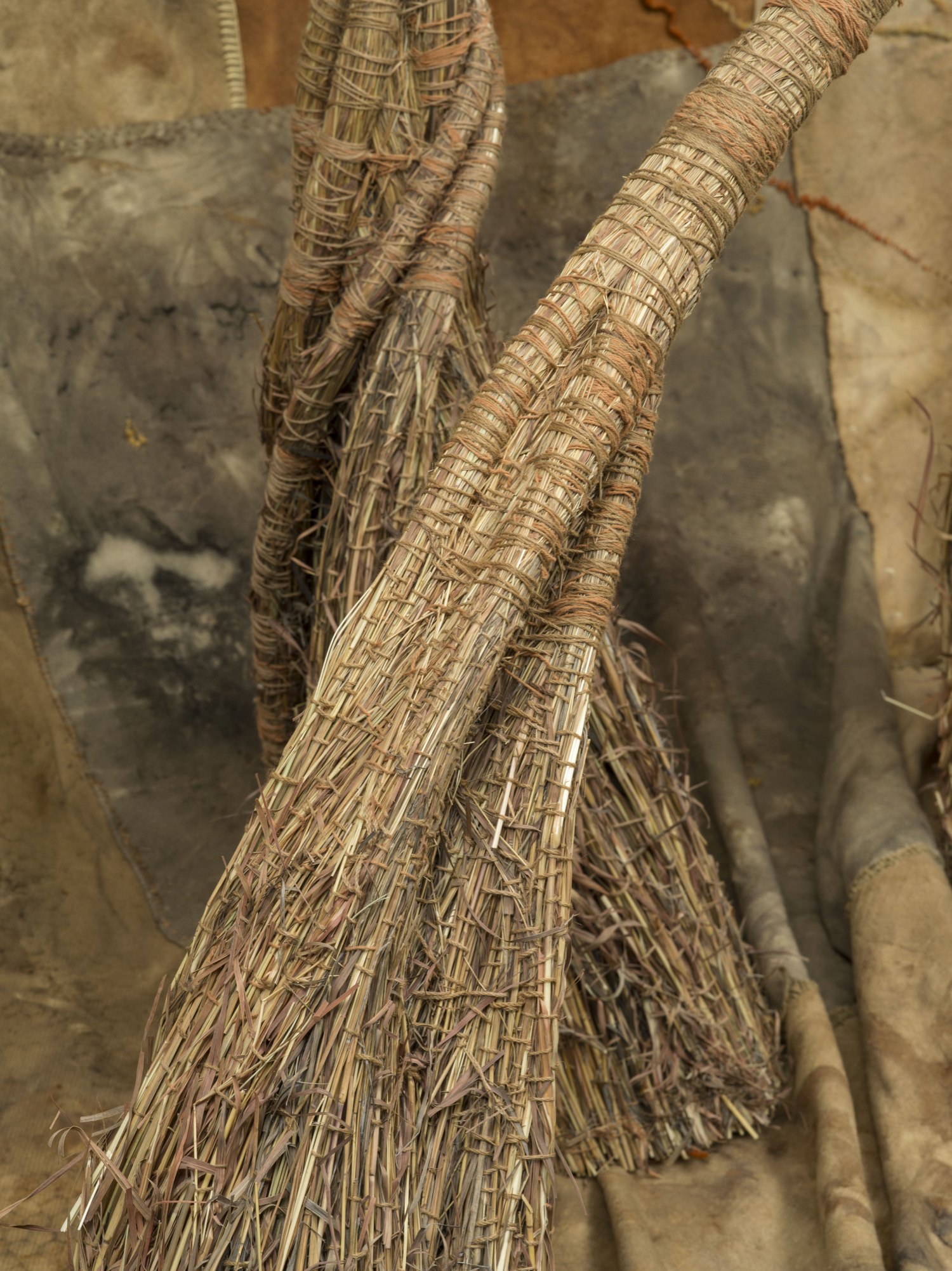 Mixed media installation: wool, silk, cotton, native grasses, spear grass, bone