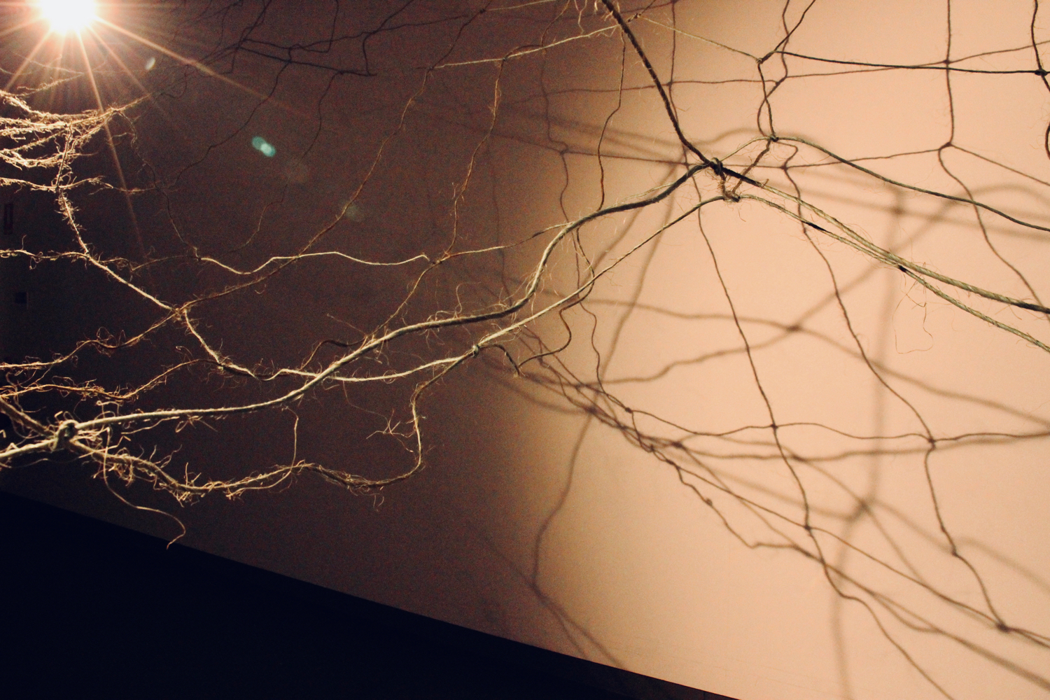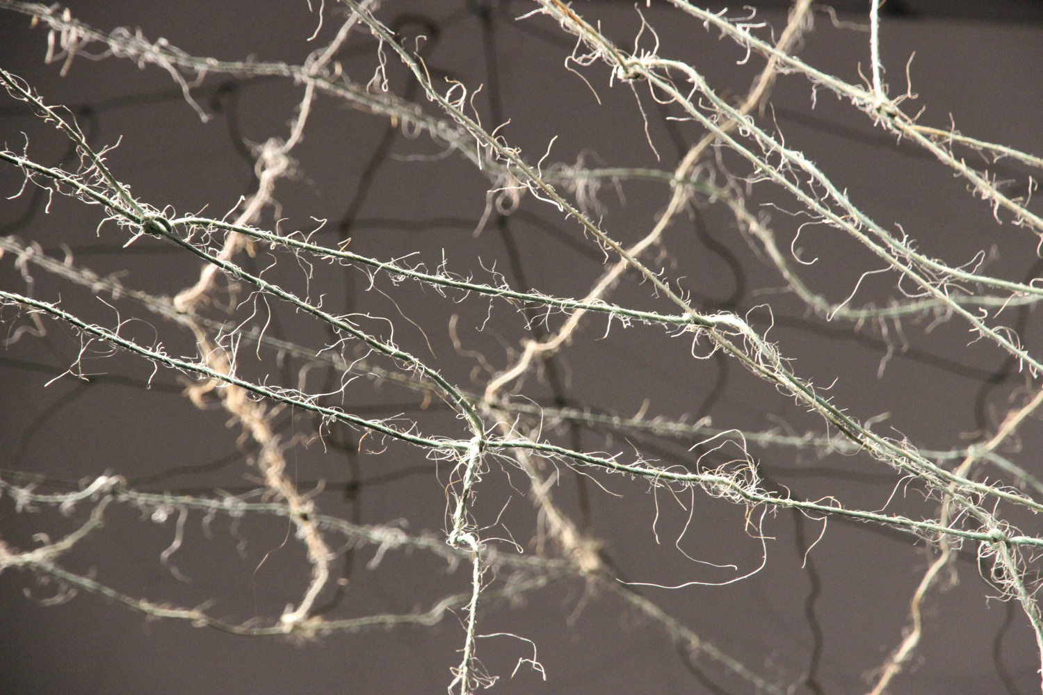 Netted Land reminiscences my own childhood through the material use of this vintage haystring. Knotted into a large net form it references the Kaiabara and the nets they may have made and used. Netted Land also refers to post-colonial, unsustainable, industrialised agriculture imposed on this fragile land.