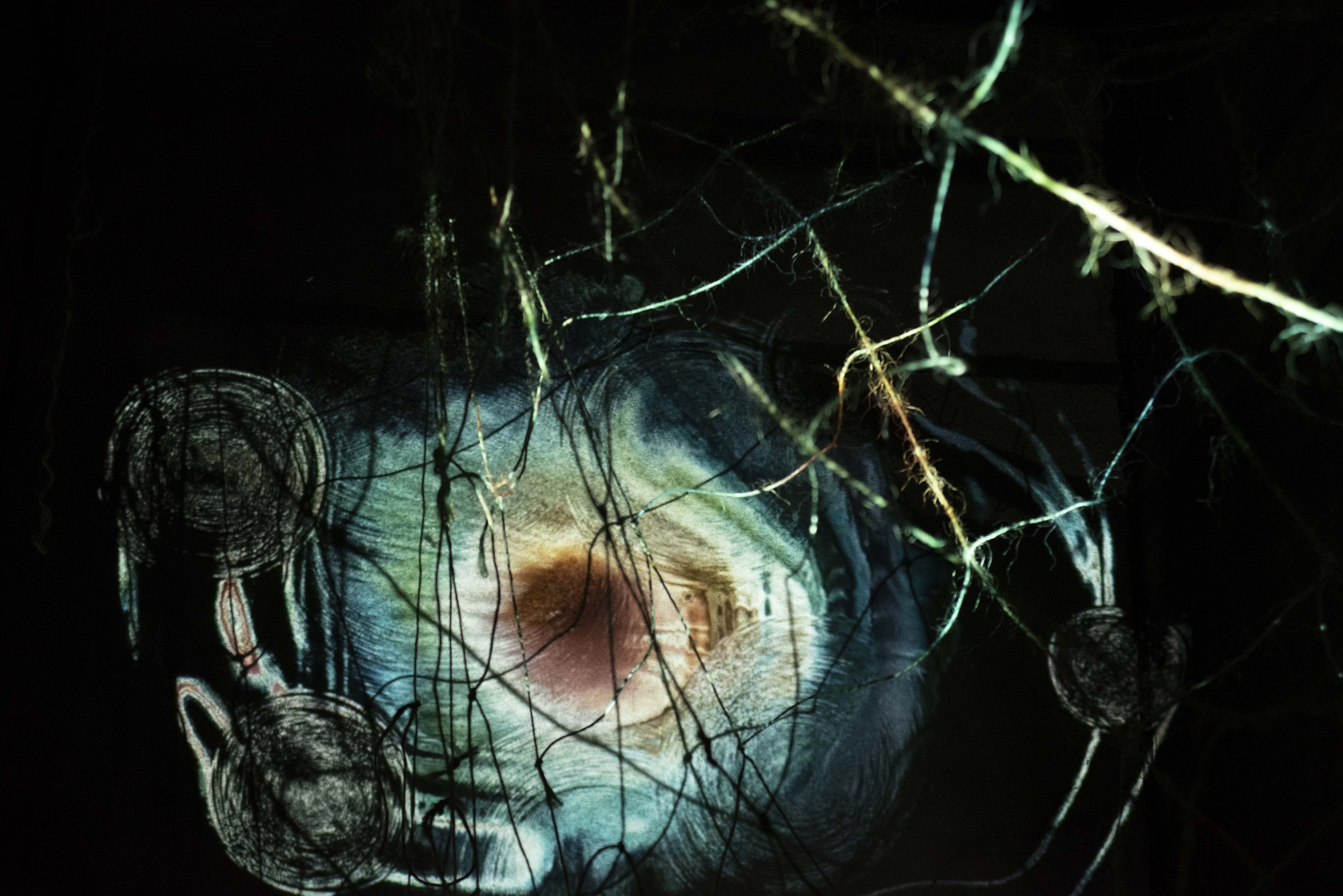 Above: My work Vanishing Foodbowls and Netted Land, interacting with Anastasia Turina’s gorgeous digital projection Colour 32 in the stunning interplay between light, colour shadow and the moody space of the Spring Hill Reservoir, 2018.