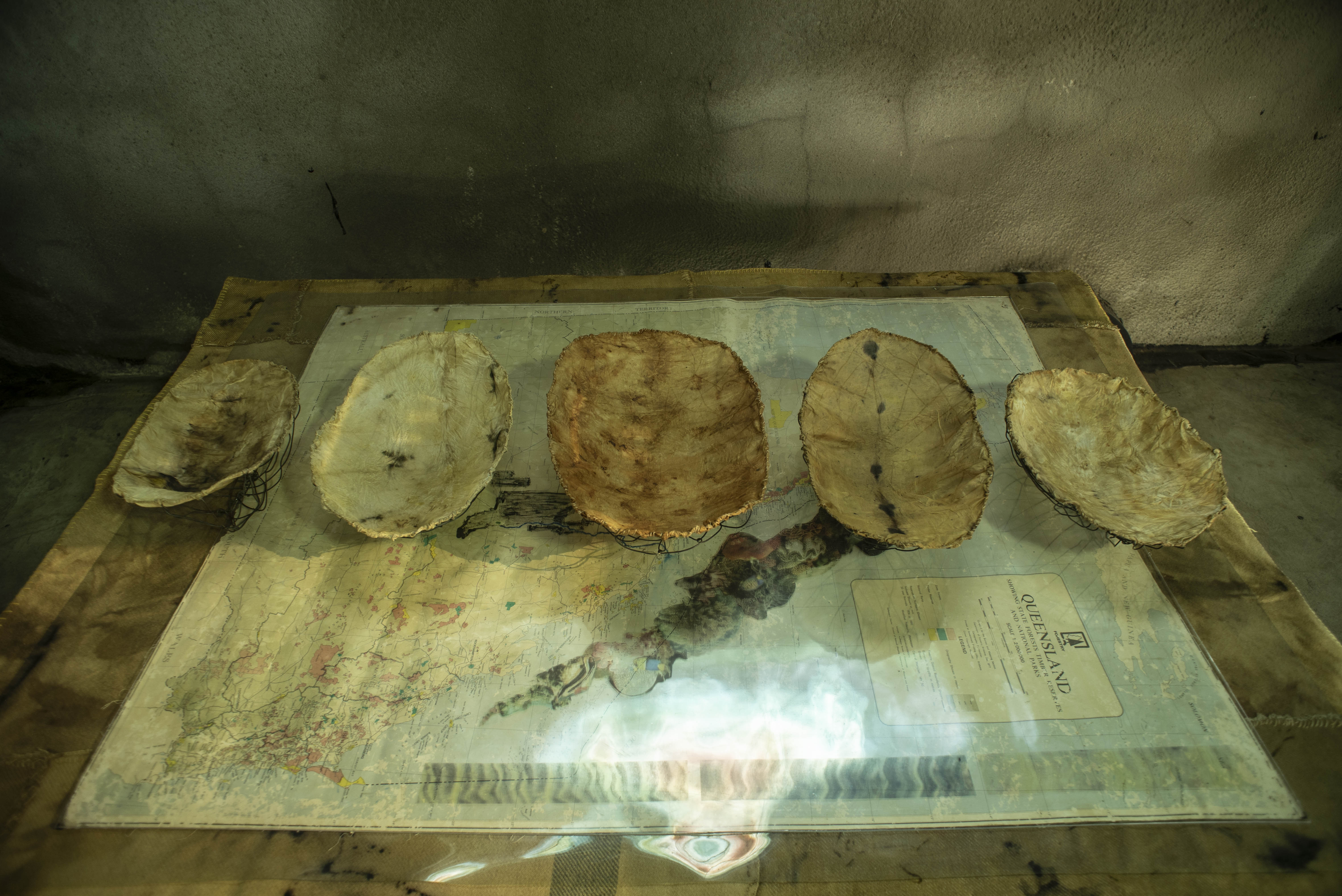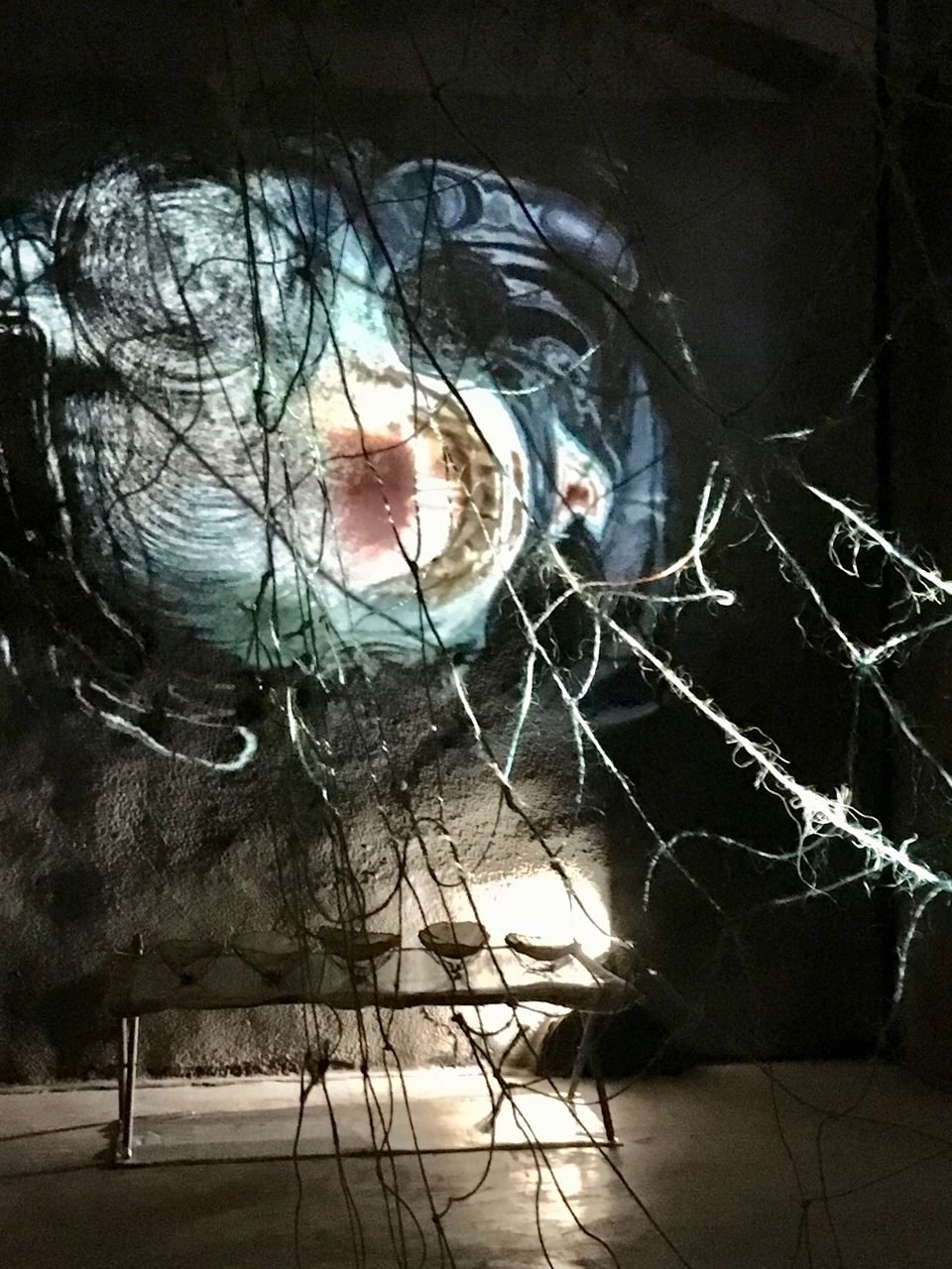 Two of my artworks Netted Land and Vanishing Food Bowls were part of the RONA18 exhibition. These artworks were installed to integrate with a video projection work titled Colour 32 by Anastasia Tyurina. Tyurina’s stunning video explores water using microphotography and was projected through Netted Land onto one of the subterranean walls of the old Spring Hill Reservoir. Netted Land captured across its form and fibres, light and colour from Tyurina’s projection. This created a really interesting walk through installation experience.