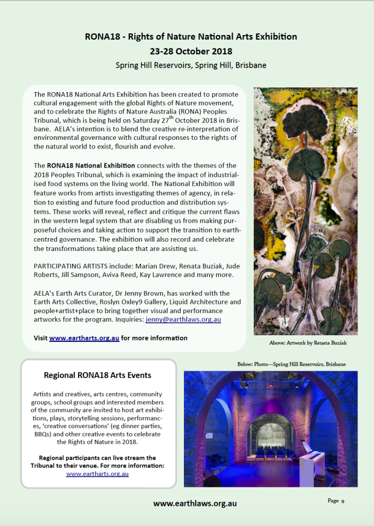 From October 2016 to 2018 I was an Earth Arts RONA (Rights of Nature) artist in Residence. This included attending the 2016 People’s Tribunal for the Rights of Nature and workshops to learn about the foundations and proposals of the Australian Earth Laws Alliance. I continued my connection and commitment to Earth Arts, but was unable to attend further workshops and residency programs for a time due to personal and study commitments. However I continued my connection in 2018 my artwork was included in the Rights of Nature National Arts Exhibition, curated by Jenny Brown, 23 – 28 October 2018.