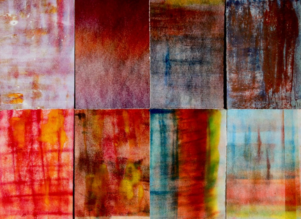 This series of monotypes were inspired by the woollen blankets of my 70’s childhood. I grew up on a farm in a wooden, high stumped, high ceilinged Queenslander house that had been built in the 1930’s. When we moved there the house had barely changed since it had first been built, but was ageing. We have cold winters in this valley. These houses are very cold and the only heating then was the slow combustion cooking stove in the kitchen. On winter nights we piled on the blankets. The blankets were strong and heavy, while richly and warmly coloured. Their weight and their warmth gave me a childhood security. I now use some of these blankets on my own children’s beds. When I look at these monotypes I am always back in my childhood with these old blankets.
