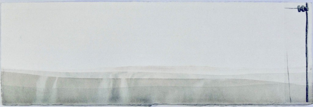 This work records the simple metal post and insulator that held the single wire. The wire is invisible except in certain light as it is embossed into the paper. This represents the almost invisible wires that my pony bolted through that twilight evening.
