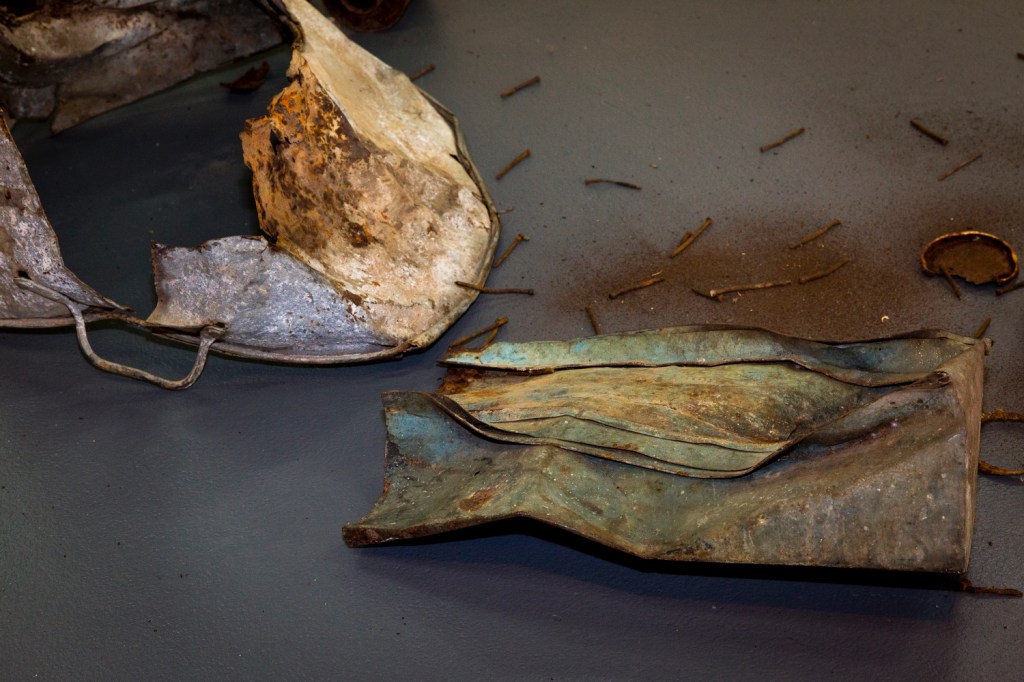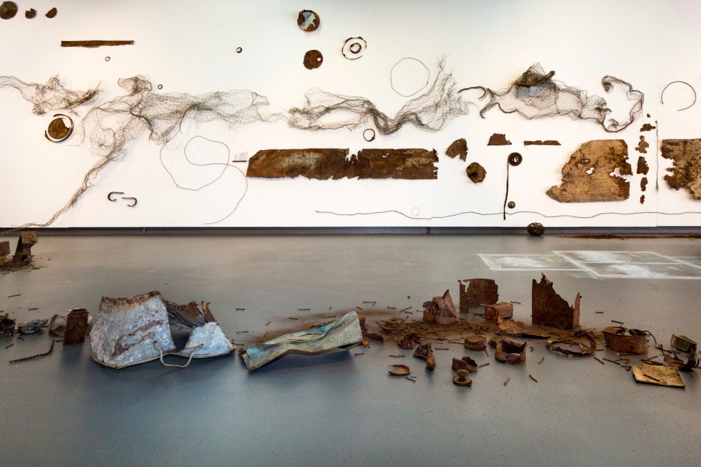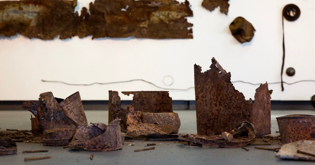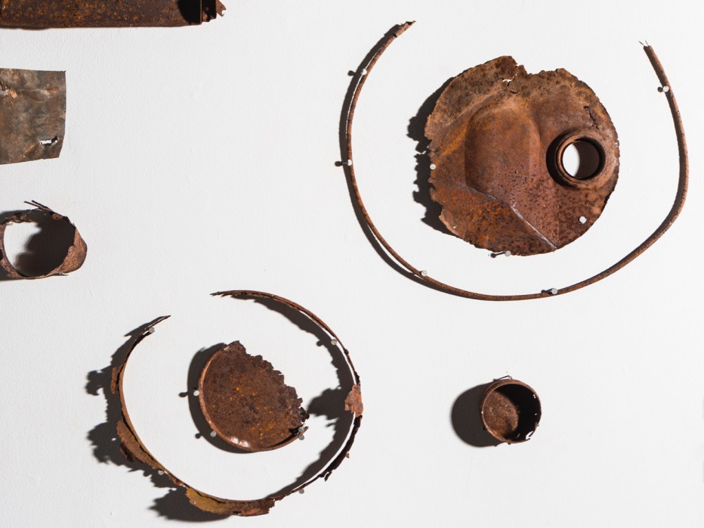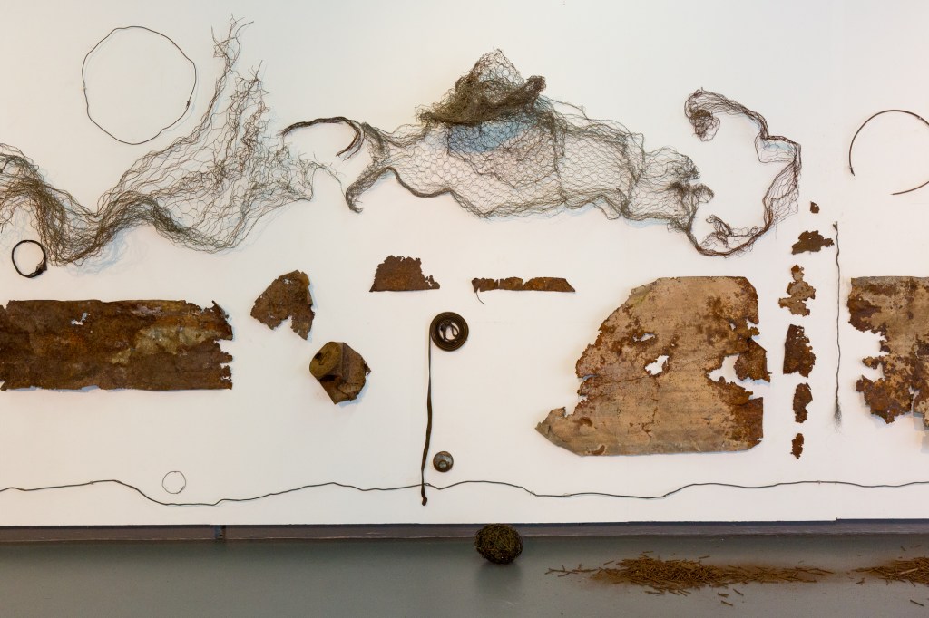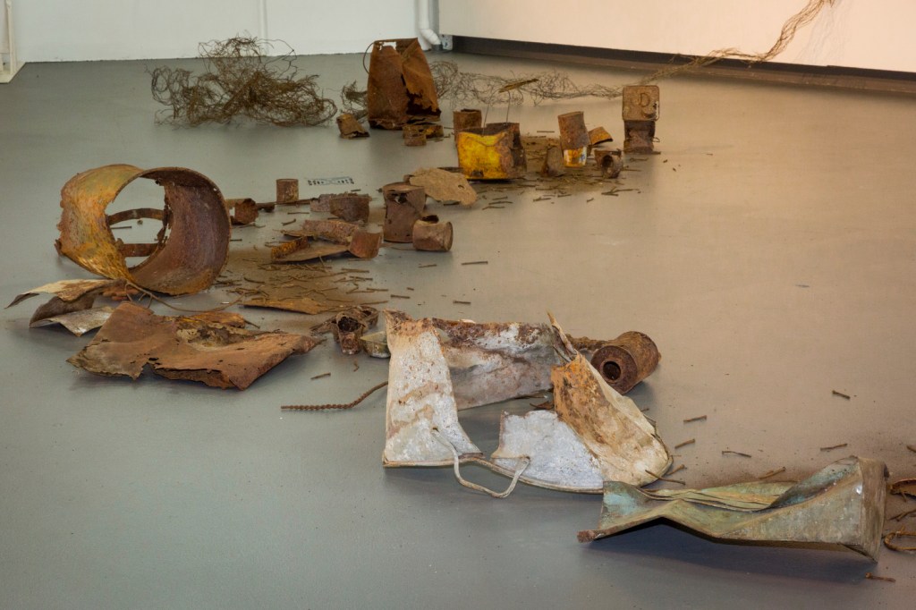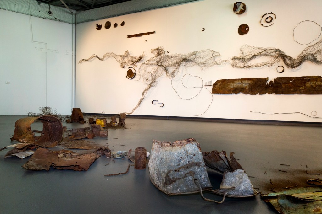 Found objects, wire, tin, steel, iron, wonga wonga vine, leather, wood, chalk.