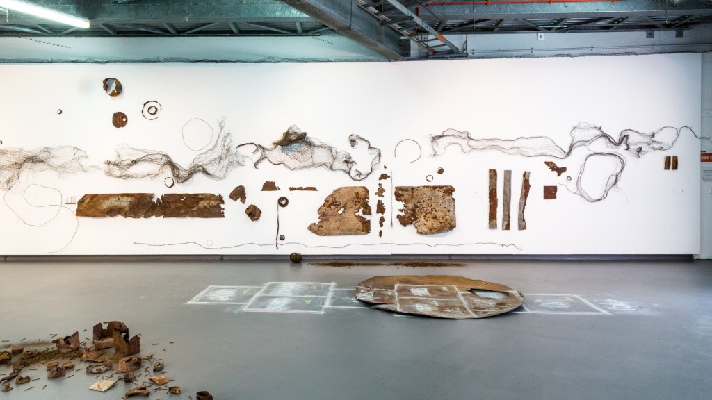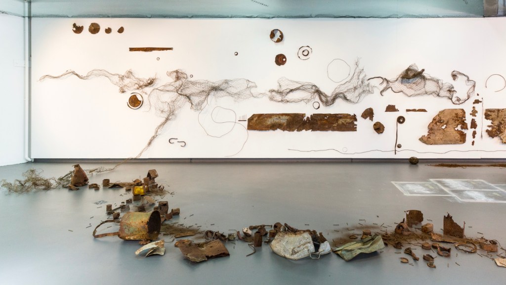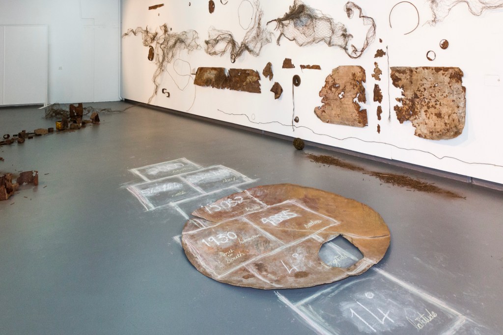 I have taken discarded settler materials, mostly sourced from the remnants of the farm dump that was in operation between 1908 and 1973, and recreated a sense of the landscape and its human history. The floor installation Squatters Hopscotch explores the beginnings of a relentless and bloody land grab when Squatters leapfrogged their vast herds of sheep and cattle over each other to take land that was already owned and occupied. This act of thievery began the tragic waves of frontier wars. House and Fence, a sculpture of discarded wire, references both the squatter’s house still visible on a hill overlooking the valley and the homes of the Kaiabara people. (scroll down for more on Squatters Hopscotch, also House and Fence)