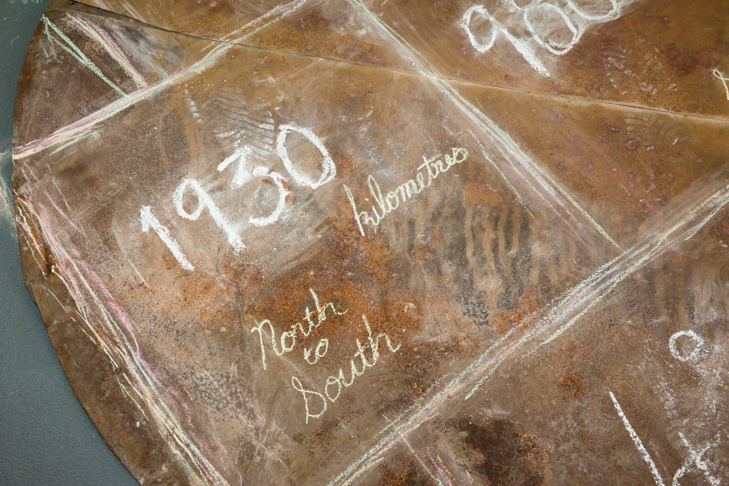 Based on a children’s game of hopscotch, this artwork incorporates part of an iron water tank and text. The tank represents the rapid change of land use and booms with sound when hopscotch is played on this particular court. Each of the squares carry text relating to colonial expansion which was taught and celebrated through schools as I was growing up. Chalk, traditionally used to describe the hopscotch court, also describes the unstable boundaries of land claims as squatters continually moved beyond the legal limits of settlement.